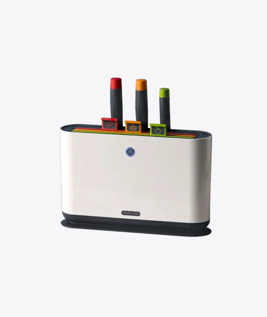 Acest sterilizator folosește tehnologia UV pentru a preveni răspândirea mucegaiului și a bacteriilor pe tacâmuri și tocătoare. Include trei tocătoare și trei cuțite, fiecare destinat unui tip diferit de aliment, pentru a evita contaminarea încrucișată și mirosurile neplăcute.